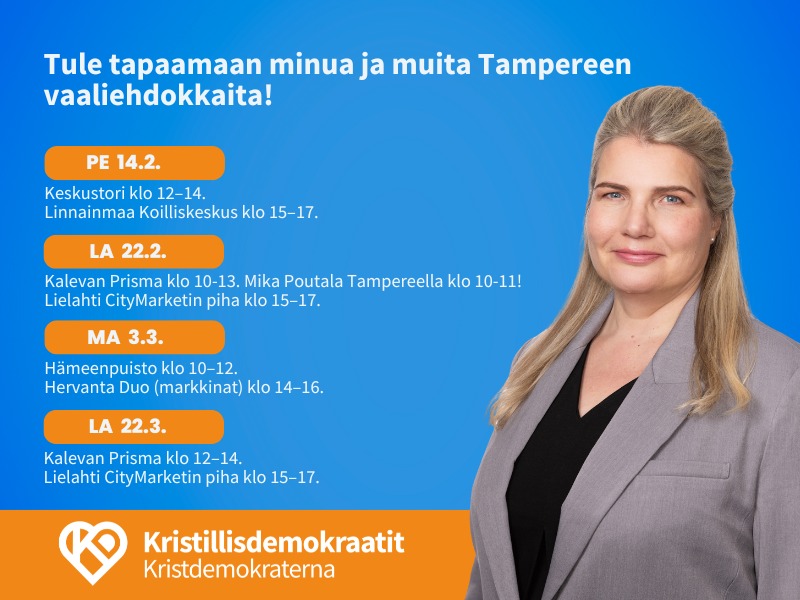 Toimin Kristillisdemokraattien Tampereen paikallisosaston puheenjohtajana vuosina 2024–2025. Nuo vuodet olivat intensiivisiä ja opettavaisia: politiikka tuli tutuksi käytännön kautta, keskellä vaaleja, ihmisiä ja arjen järjestelyjä. Puheenjohtajana pääsin mukaan useisiin vaaleihin ja näkemään läheltä, miten puolueen toiminta rakentuu paikallistasolla, usein ilman valmiita rakenteita. Samalla tutuksi tulivat ihmiset, yhteistyö ja vaikuttamisen todellisuus Tampereella ja Pirkanmaalla. Kesällä 2025 minut valittiin myös puoluevaltuustoon.